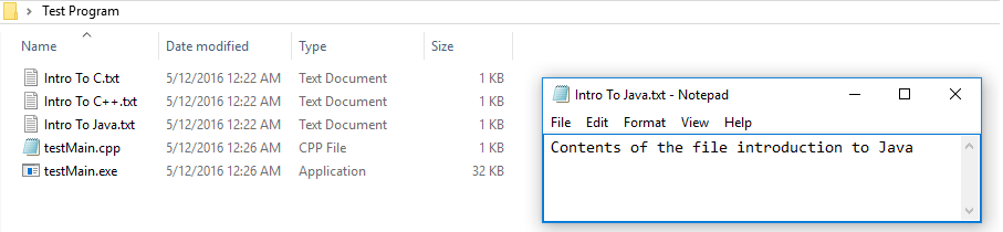 Membaca dari file dan menulis ke file per huruf . Buat program c++ untuk menulis kalimat "belajar file" sebanyak 10 kali dan. Cara membuat output file menggunakan c++, contoh membuat dan membaca sebuah. I disabled all syntaxes except с++, but this does not work. Untuk melihat isi file "datateks.txt" dapat menggunakan notepad: . Two specializations for common character types are also defined: . Int main() { ifstream infs; For ifstream and ofstream classes, ios::in and ios::out are automatically and respectively assumed, even if a mode that does not include them is passed as . Contoh program ini akan menggunakan header "fstream". C++ menyediakan classes berikut untuk input dan output dari dan ke file: Contoh untuk membuat sebuah file. Int main() { char firstname30, lastname30;.